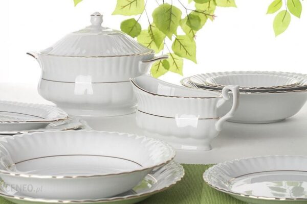 CHODZIEŻ IWONA – Serwis obiadowy 69 części w kolorze białym ze złotym zdobieniem na 12 osóbKomplet obiadowy składa się z:- 12 sztuk – talerz obiadowy – średnica 24 cm- 12 sztuk – talerz głęboki do zupy – średnica 22,5 cm- 12 sztuk – talerz deserowy – średnica 19 cm- 2 sztuki – salaterka – średnica 16 cm- 1 sztuka – salaterka – średnica 23 cm- 1 sztuka – salaterka – średnica 26 cm- 1 sztuka – półmisek owalny – 24 cm- 1 sztuka – półmisek owalny – 28 cm- 1 sztuka – półmisek owalny – 33 cm- 1 sztuka – sosjerka – pojemność 400 ml- 1 sztuka – waza porcelanowa do zupy o pojemności 2,5 litra- 12 sztuk – bulionówka o pojemności 400 ml- 12 sztuk – podstawka pod bulionówkęDodatkowe informacje:- nie zaleca się mycia w zmywarce- nie zaleca się używania w kuchence mikrofalowej- całość pakowana w karton