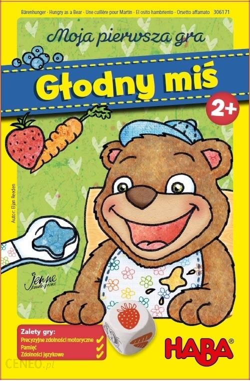 Moja pierwsza gra: Głodny miś to zestaw gier dla 1 – 3 graczy, w wieku 2+ lat, z łyżeczką do karmienia misia.Gra stymuluje i rozwija u dziecka: motorykę małą, empatię oraz zdolności językowe. Jedną rzecz możemy zagwarantować – udaną zabawę!Zestaw gier zawiera 4 warianty gry:Swobodne granie – Poproś dziecko, aby nakarmiło zwierzę (na początku czynność karmienia może sprawiać trudności, ale z praktyką dziecko nauczy się, w jaki sposób należy trzymać łyżeczkę). Porozmawiaj i zadawaj pytania na temat jedzenia, np. czy lubisz borówki? czy smakują ci marchewki?, itp. Zastanów się z dzieckiem, jakie imię wybrać dla małego misia.”Mały Miś jest bardzo głodny” – Gra kooperatywna dla dzieci w wieku 2+ lat”Mały Miś jest wygłodniały” – Gra pamięciowa dla dzieci w wieku 2+”Zgadnij jakie jest moje ulubione danie?” – Gra rozwijająca zdolności językowe oraz słownictwo dla dzieci 3+