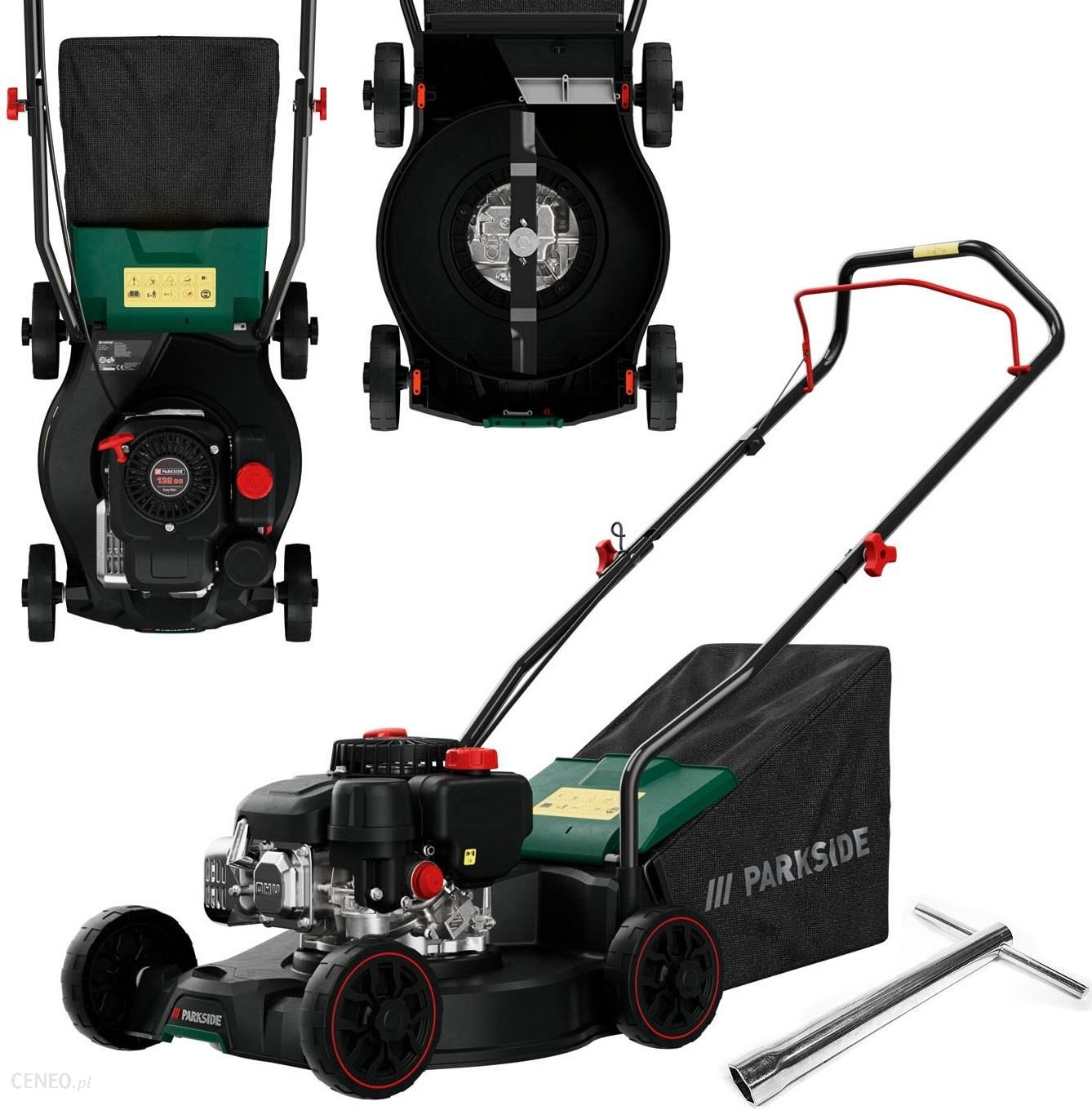 Kosiarka Parkside PBM 132 B1 spalinowaKlucz do świec zapłonowychZestaw do mulczowaniaKlucz z gniazdem sześciokątnymWkrętakInstrukcja obsługiOryginalne opakowanie