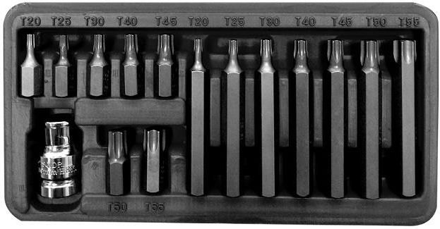 Zestaw końcówek, bitów 3/8″ TORX T20-T55- Zestaw wykonany z najwyższej jakości stali stopowej narzędziowej S2, która charakteryzuje się:wysoką twardością HRC 58-62jednolitą, drobnoziarnistą strukturą materiałuodpornością na skręcaniewysokim momentem dokręcania – 21,8 Nm- Skład zestawu:Adapter 1/2″ – 10mm Klucze Torx po 1 szt. 30mm i 75mm : T20, T25, T30, T35, T40, T45, T50, T55