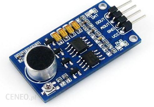 Moduł czujnika dźwięku. Moduł posiada 2 wyjścia analogowe mogące służyć do pomiaru natężenia dźwięku oraz cyfrowe do np. detekcji dźwięków otoczenia, wzmocnienie regulowane jest za pomocą potencjometru. W zestawie znajdują się również przewody połączeniowe.OverviewOnboard audio power amplifier LM386Audio signal gain up to 200Adjustable voltage amplitude for analog outputSignal output indicatorSpecificationsPower: 3.3V ~ 5.3VDimension: 39.0mm * 21.0mmMounting holes size: 2.0mmApplicationsAmbient sound detectionSound level detectionHow to UseIn the case of working with a MCU:VCC ↔ 3.3V ~ 5.3VGND ↔ power supply groundAOUT ↔ MCU.IO (analog output)DOUT ↔ MCU.IO (digital output)Package ContainsSound Sensor × 1http://www.wvshare.com/img/devkit/general/4-pin-custom-connector-jumper-wire.jpg × 1DownloadsDevelopment resources: demo codes, schematic, datasheets, etc. /pl/p/file/4e67763648827cbb819956cd33dc11b4/Sensor-Kits_elty.pl.zip